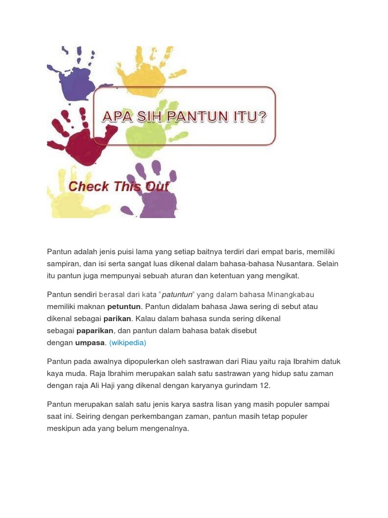 Lalu didalam bahasa jawa, pantun dikenal sebagai parikan, didalam bahasa sunda dikenal sebagai paparikan sementara didalam bahasa van ophuysen dalam hamidy (1983: Kalau dalam bahasa jawa pantun sendiri dikenal dengan nama sebutan parikan. Puisi tentang pendidikan dan puisi tentang romantis ? Pantun merupakan bentuk puisi lama yang dikenal luas dalam berbagai bahasa di nusantara, dalam bahasa jawa pantun dikenal sebagai parikan, sedangkan dalam bahasa sunda pantun dikenal sebagai paparikan. Di kalangan masuarakat jawa, istilah pantun juga dikenal sebagai parikan, sedangkan dalam bahasa sunda dikenal sebagai paparikan.